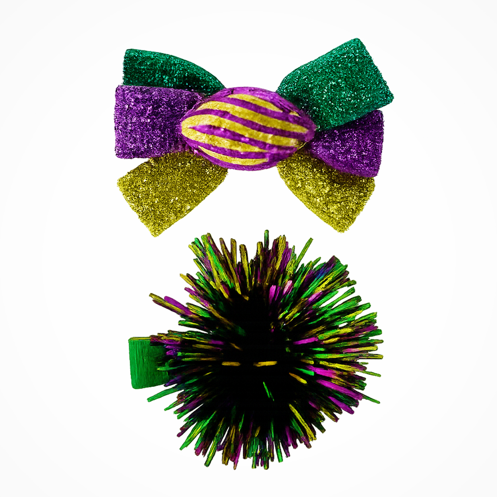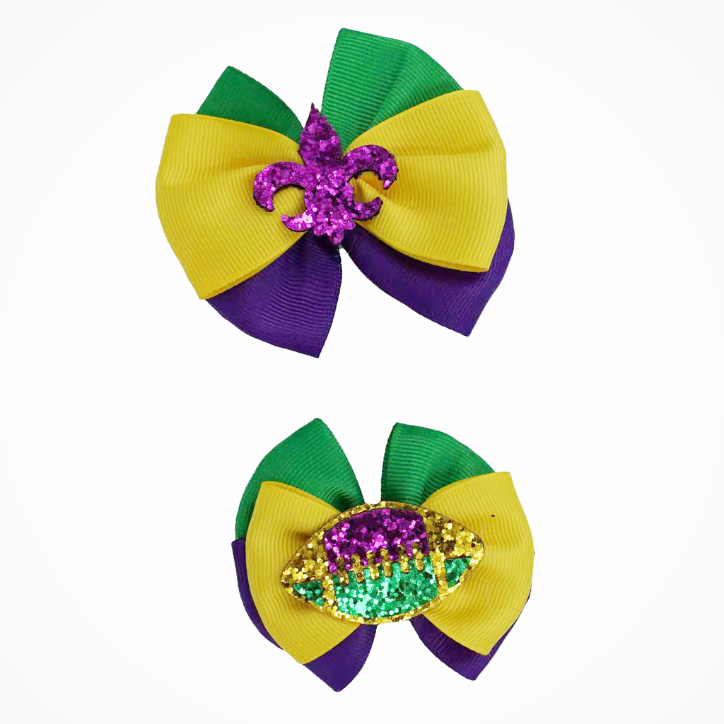 Mardi Gras Bow Hair Pins with Football Accents and Pom-Pom